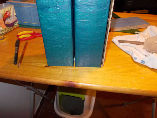Entonces, y como si de un libro se tratara, un pasé forrar el cajón. Se puede usar cualquier tipo de papel o si nos gustan los colores de los cartones usados, no hace falta forrar. En mi caso yo usé un papel de envoltorio había comprado por navidades y que me sobró, además, al ser de color azul, queda de un juego con las maderas de la estructura externa.