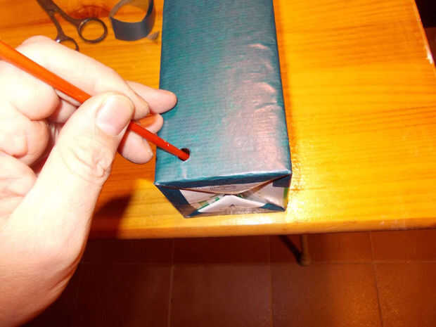En este punto empiezo a enrollar el cajón como si estoy envolviendo un libro. Puede utilizarse todo tipo de papel, kraft, chatarra o cualquier cosa o si te gusta la leche del cartón decoración, nada. En mis cajas de leche, la parte inferior es donde los códigos de barras se va para un lado y la dirección de la granja para el otro, y no me gusta. Usar azul papel kraft que de envolvente la Navidad pasada presenta, pegado a los cajones con cola de carpintero blanca extendida con un pincel.