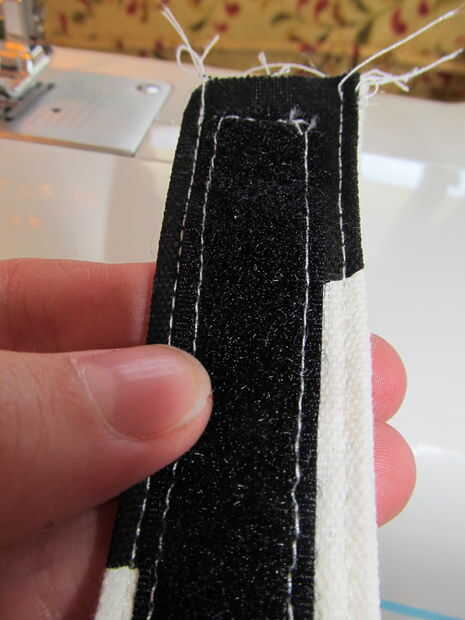 7. ahora coser un lado del velcro sobre la tira larga (unos 10" vale la pena) y el otro lado en la tira corta (aproximadamente 6" vale la pena)