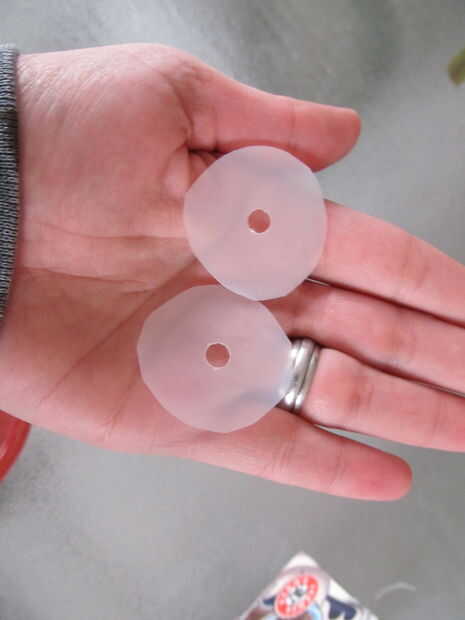 Luego cortar 2 arandelas plásticas de una jarra de plástico de leche o algo similar que son alrededor de cuarto de tamaño. (usar un sacador de agujero en el centro) Estos ayudan a evitar que el nudo tirando a través de la caja de cartón.