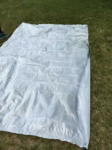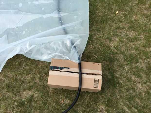 Ahora que ha sellado todos los bordes, es tiempo de llenar tu gota de agua. Poner una manguera en el agujero que dejaste para él. Encender el tubo y esperar a llenar. Si trabajas en una pequeña colina, (como) poner algo para mantener la parte arriba en su lugar por lo que no se desliza. También aumentar un poco la manguera de manera que el agua no se derrame hacia fuera.