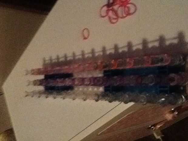 primero necesitas:BandasA - cantidad 28B - cantidad 12C - cantidad 12Necesitas la flecha del telar mirando hacia fuera.Paso 1: Colocación de bandas Coloque su primera una banda como se muestra en el cuadro 1. La segunda A la banda como se muestra en