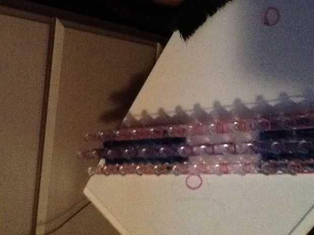 primero necesitas:BandasA - cantidad 28B - cantidad 12C - cantidad 12Necesitas la flecha del telar mirando hacia fuera.Paso 1: Colocación de bandas Coloque su primera una banda como se muestra en el cuadro 1. La segunda A la banda como se muestra en