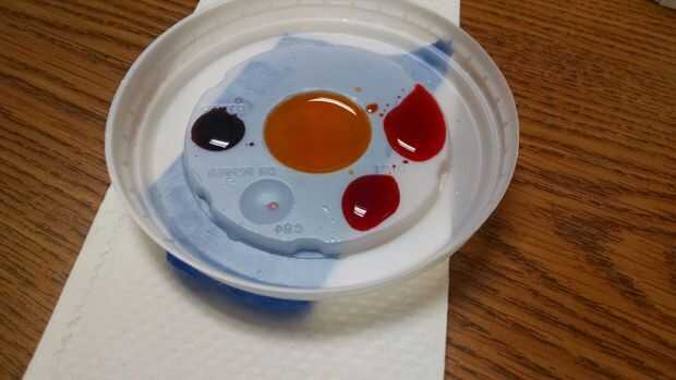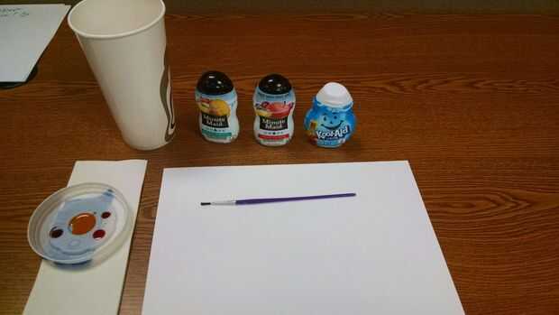 • Un recipiente para mantener las gotas de jugo (utilicé una tapa de plástico para tomar una copa. Funcionó excelente para cada gota de color. También he añadido algunas cintas debajo de la tapa donde la paja se pasa para evitar fugas)