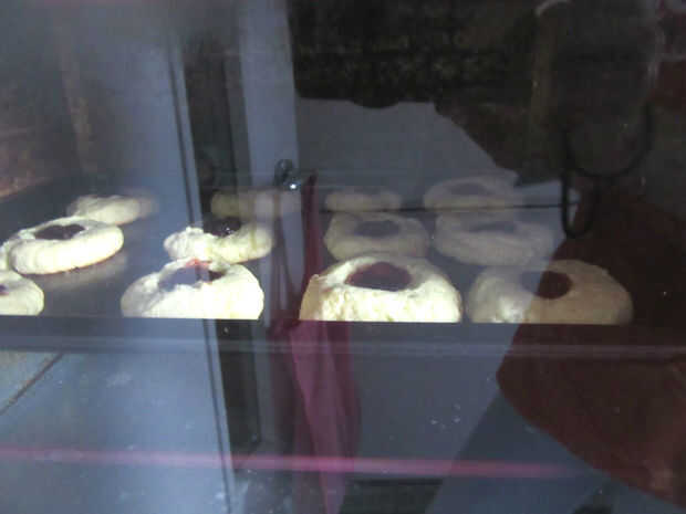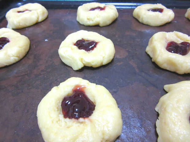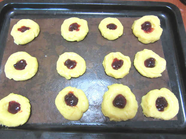 Algunos mermelada en la muesca de la cuchara en la masa. Hacer seguro que no pones en demasiada mermelada, así que cuando hierve, no explotar en la cookie.