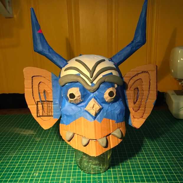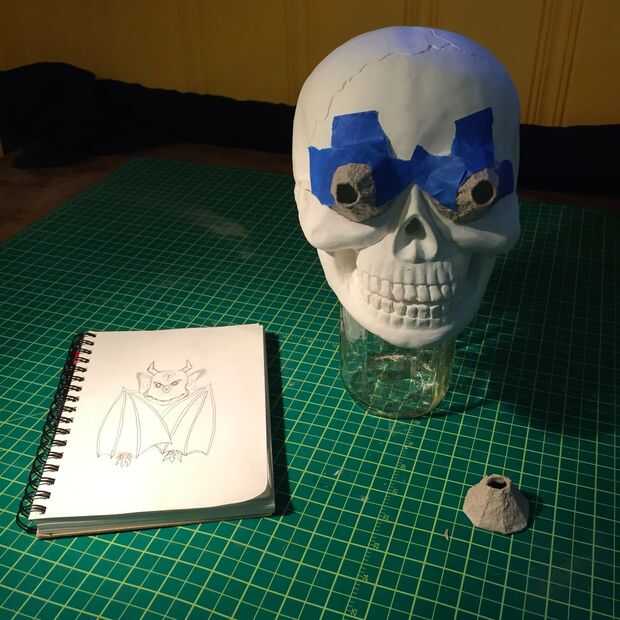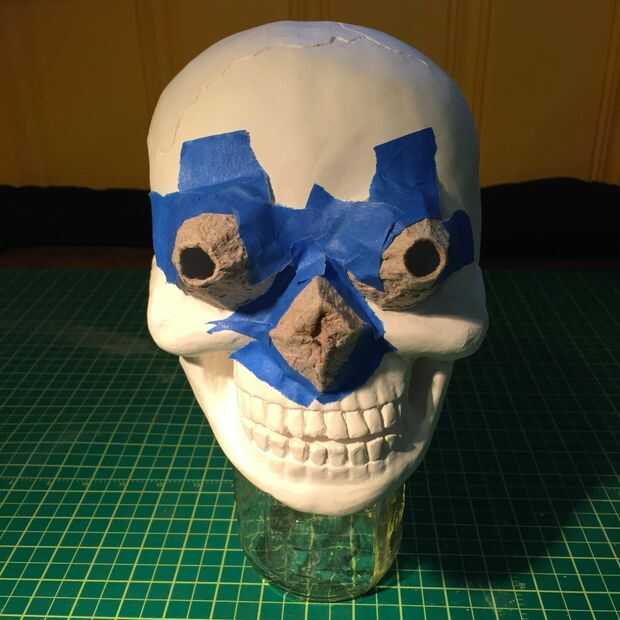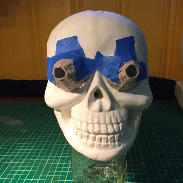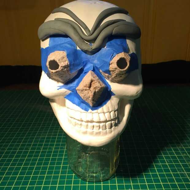 - Tengo el cráneo a la venta en una tienda de artesanía local por $3, pero se podría hacer con otros objetos de tamaño de la cabeza. Esta máscara terminó siendo para un niño, por lo que salió, pero hubiera tenido que hacer algo diferente para un adulto para adaptarse a la cabeza de la máscara. Había apuntalado el cráneo con un tarro de masón, que también sirve como un molde para un cuello.