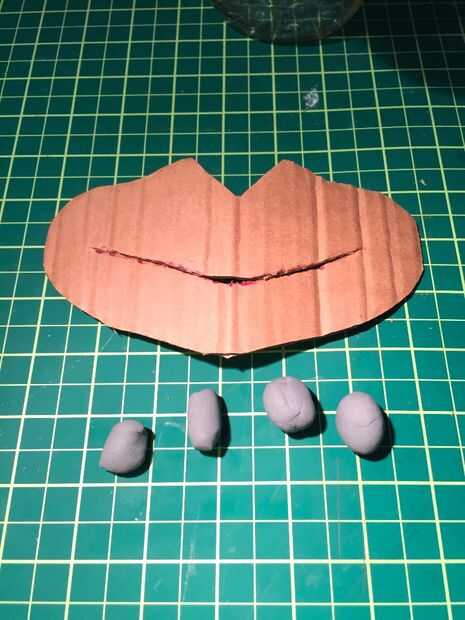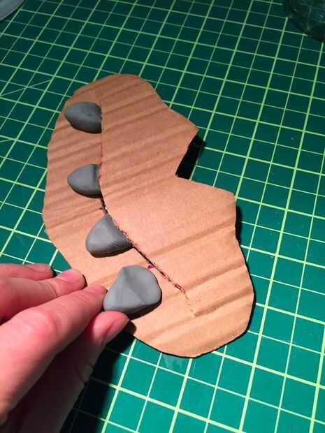 - Agregar los dientes de forma de la boca. Otra vez, utilicé arcilla sobrante para hacer grasa, triangular-ish los dientes. Luego aplanar la base y había pegado a la base de la abertura de la boca de la cartulina.