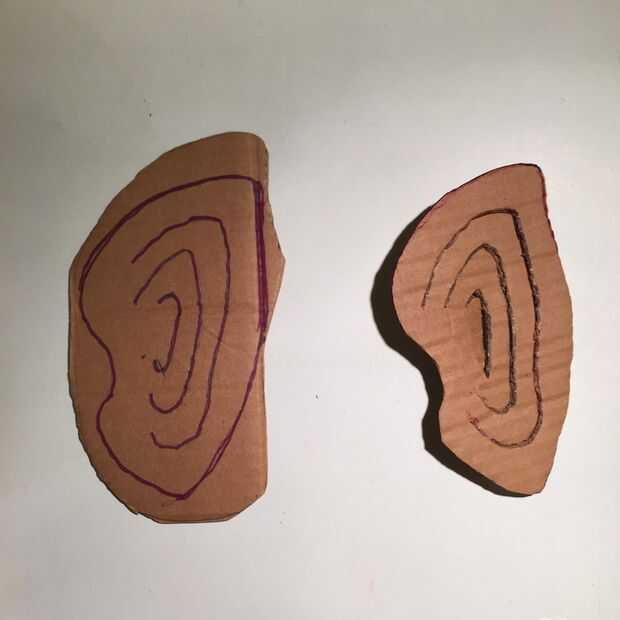 - Cortar las orejas hacia fuera y fije al cráneo. Hice las orejas de cartón y hechos cortes paralelos a los bordes para poder plasmar las orejas más.