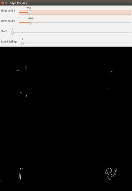 Con el script de python en el repositorio de git y las instrucciones en el repositorio de git, ejecute el script. Una pantalla negra con unas líneas blancas que indican los bordes calculados (mediante detección de bordes de canny). El siguiente paso es reducir al mínimo siempre que sea un borde no va a ser y hacer que los bordes aparezcan claramente donde el objeto es ajustando las dos barras superiores. Cuando la imagen seleccionada se describe correctamente puede haga clic en Inicio para pasar a la siguiente imagen. Si todas las imágenes parecen como configuración de un está funcionando bien, puede haga clic en Guardar configuración para procesar automáticamente todas las imágenes restantes con esas configuraciones. Cuando haya terminado, aparecerá un archivo .xyz. Esta herramienta se modificará para tener una mejor interfaz de usuario en el futuro cuando tenga más tiempo.