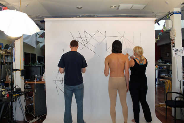 esto es un traje adorable pareja.Paso 1: Lo que usted necesita Lo que necesitas para este disfraz es2 camisas negrasCinta aislante blancotijerasSombra de ojos negroPaso 2: P Corte una tira de cinta blanca y ponerlo en tu camisa y cortar tiras más peq