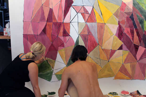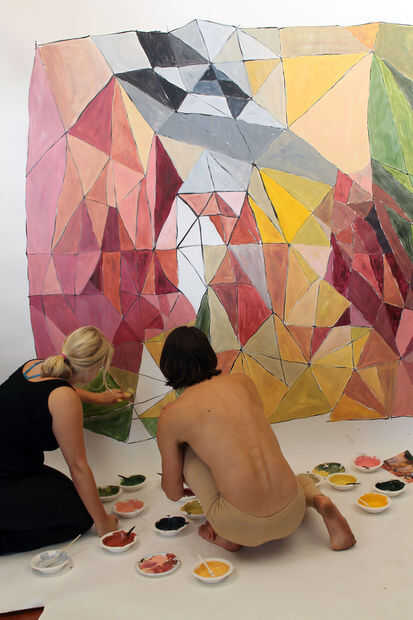 • Rellena las formas con colores mezclados.  Aunque tuvimos 20 colores después de mezclar y combinar, terminamos con muchos más matices en el lienzo porque continuamos a crear nuevos colores mientras estábamos pintando.