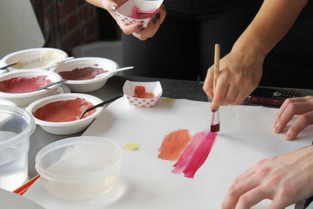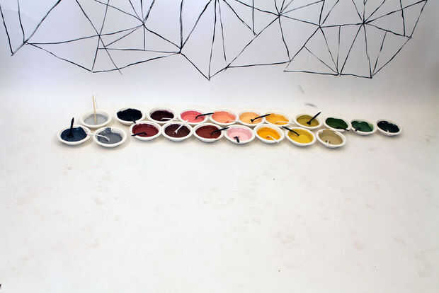 • Crear colores. Sólo compré 6 colores de pintura: blanco, negro, rojo, azul, verde, amarillo.  Con estos colores fuimos capaces de mezclar y combinar todos los colores para hacer más de 20 tonos diferentes para llenar en el telón de fondo.