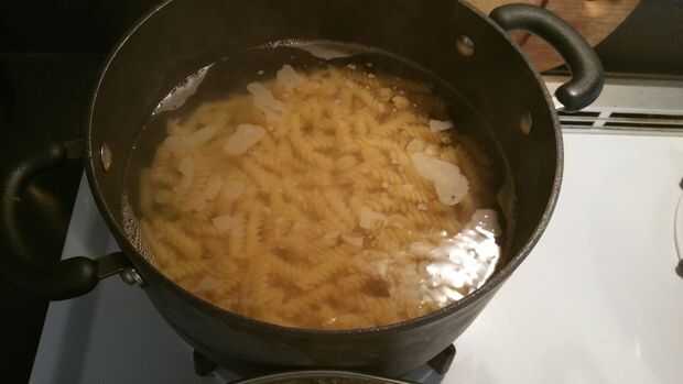 Mientras se cocinan el tocino, la cebolla y el ajo, cocine la pasta según las instrucciones del paquete en una olla grande hervir agua (generalmente de 10 a 12 minutos a fuego medio). Escurrir en un colador y reservar.