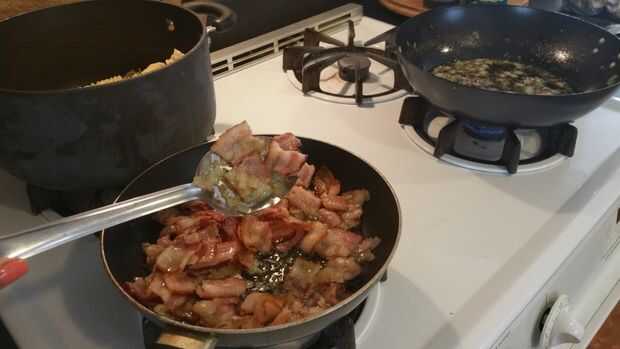 Transferencia 2 cucharadas del líquido de la sartén con la panceta a otra sartén. Ajuste el calor al medio. Usando una cuchara ranurada, trozos de tocino la transferencia a esta sartén y continuar la cocción hasta que es curruscante.