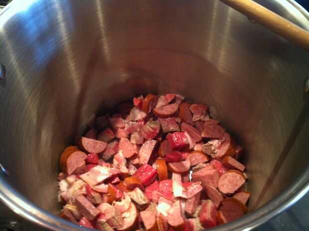 Esta mezcla en la olla con el estofado de carne y tocino, dan un stir y deje que se empiezan a cocer a fuego lento. Removemos de vez en cuando, mientras usted está cortando verduras y tapa.