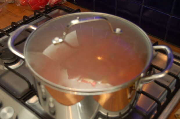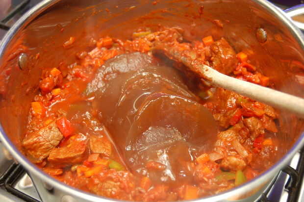 4. Añadir el caldo de carne y agua y continúe calentando hasta que hierva apenas. Ahora baje el calor lo más bajo posible, cubrir la cacerola y dejar cocinar por alrededor de una hora hasta que la carne esté completamente cocinada y casi cayendo a pedazos.