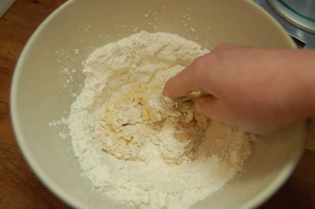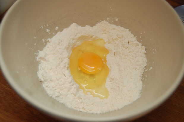 2. Añadir el huevo y mezclar con los dedos. Hacer movimientos circulares que poco a poco añadiendo más harina al huevo en el centro con cada movimiento.