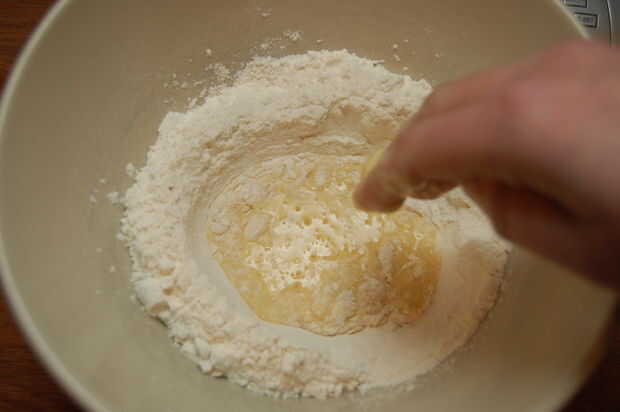 1. poner la harina en un bol y hacer un pozo en el centro.