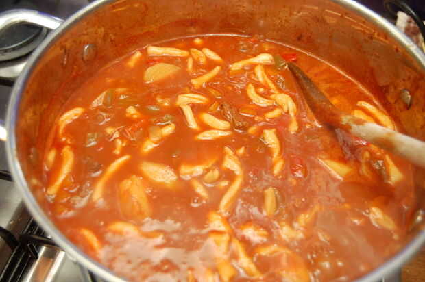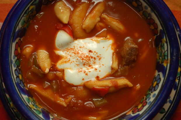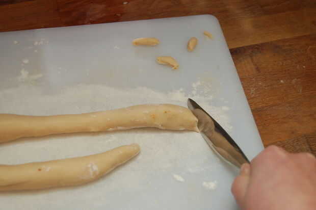 5. cuando esté listo para usar, enrolle la masa en un largo, forma de salchicha flatish corta trocitos con un cuchillo y una gota directamente en el goulash suavemente simmering. Cocinar durante unos 3-5 minutos hasta que todos los fideos estén tiernos y listos para comer.