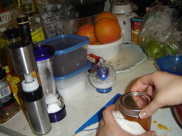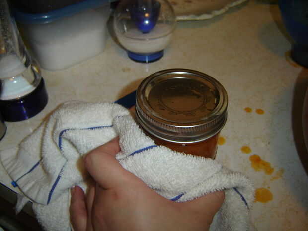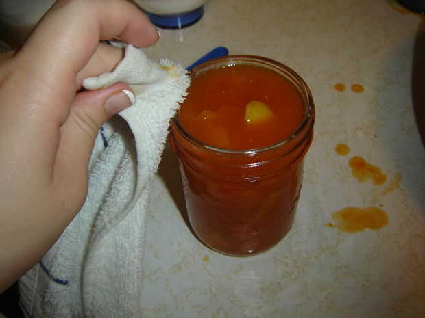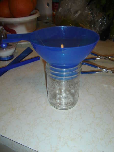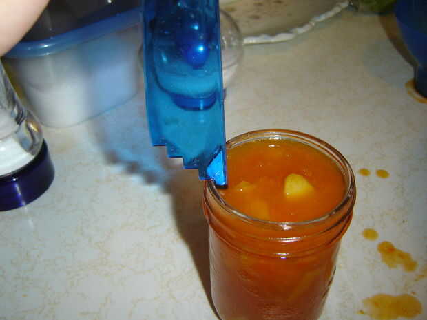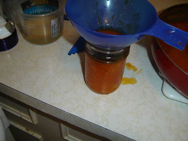 2. Coloque el embudo boca grande en la jarra y vierte rápidamente la conserva caliente en el dentro del tarro 1/4 de pulgada de la parte superior (esto es donde el indicador de espacio de cabeza viene bien). Agregar o quitar cotos según sea necesario.