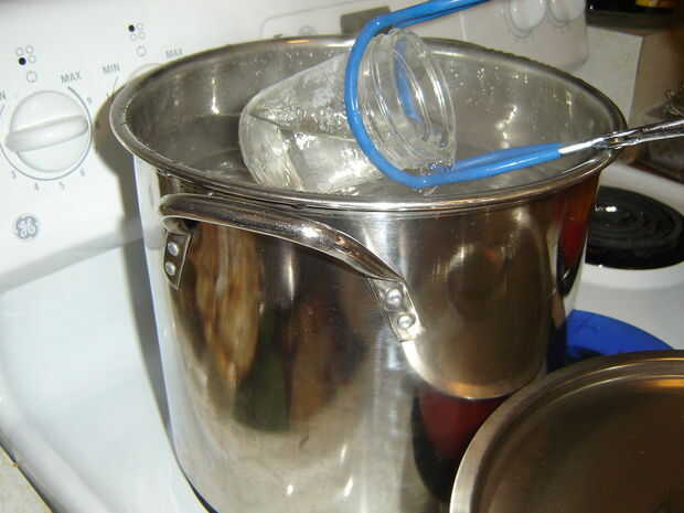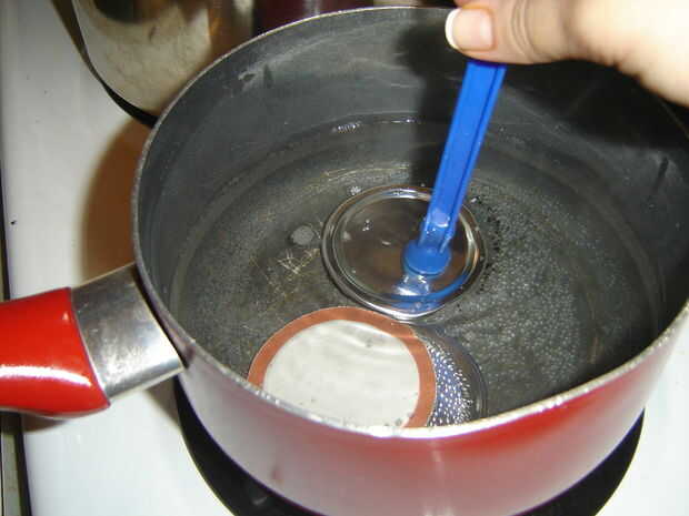 4. Limpie el borde para quitar cualquier residuo de alimento y centro de la tapa del resorte caliente en el borde del frasco limpio (uso de la herramienta tapa magnética para quitar el cierre de la tapa de la olla de hervir agua.