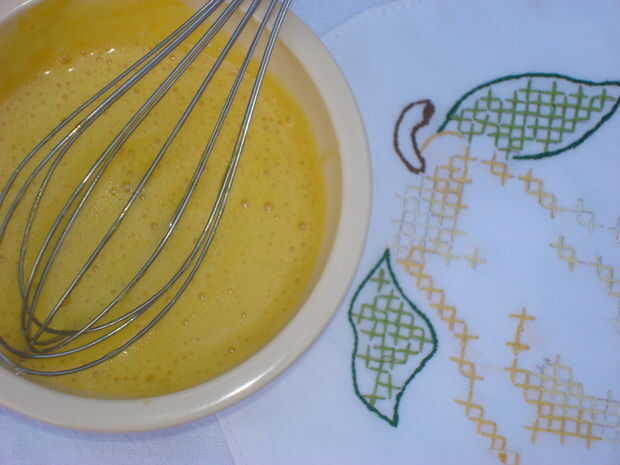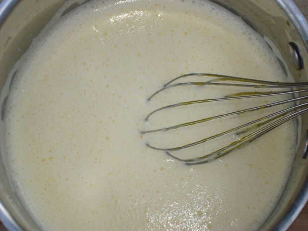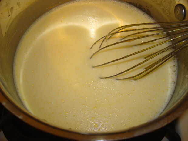 Añadir las yemas de huevo batido a la sartén muy lentamente revolviendo, verter. Continuar revolviendo hasta que se mezclan bien las yemas de huevo. Repetición: continuar revolviendo hasta que la mezcla espese y cubra la parte posterior de la cuchara. (8-10 minutos). Apagar el fuego.