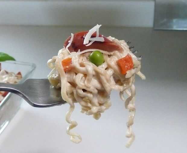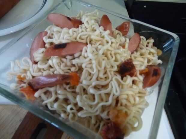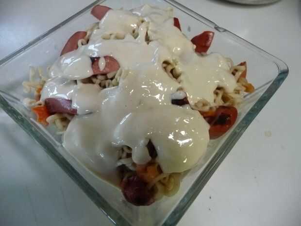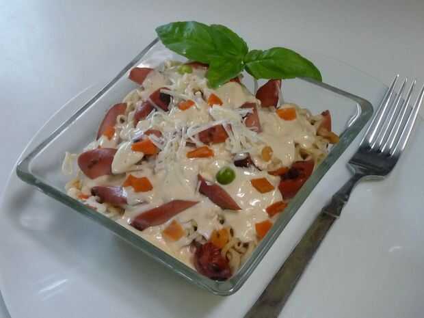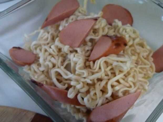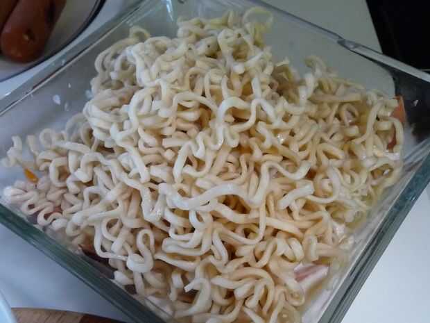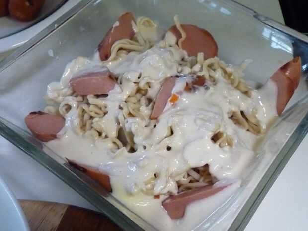 Lugar 1/2 de los fideos ramen caliente en un recipiente para servir. Esparcir 1/2 de las salchichas en rodajas. Rociar con 1/2 de la salsa alfredo. Superior con el restante los fideos ramen, salchichas y salsa alfredo.
