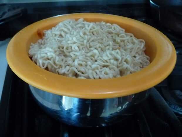 Cuando los fideos estén completamente cocidos, escurrimos sobre una cacerola pequeña. Vuelva a colocar los fideos cocidos en la Copa del envase original y cierre la tapa para evitar que se caliente.