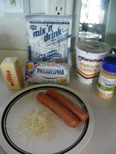 Poner el queso crema ablandado en un tazón pequeño. Agregar 1 cucharada caldo de ramen y revolver bien hasta que la mezcla esté cremosa. Agregar la leche descremada en polvo y continuar revolviendo hasta que esté suave.