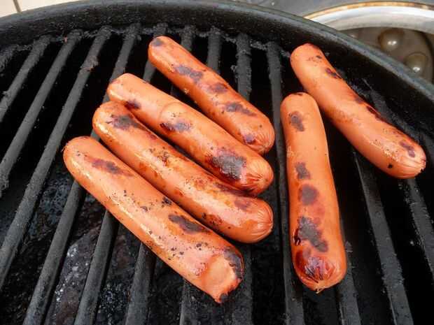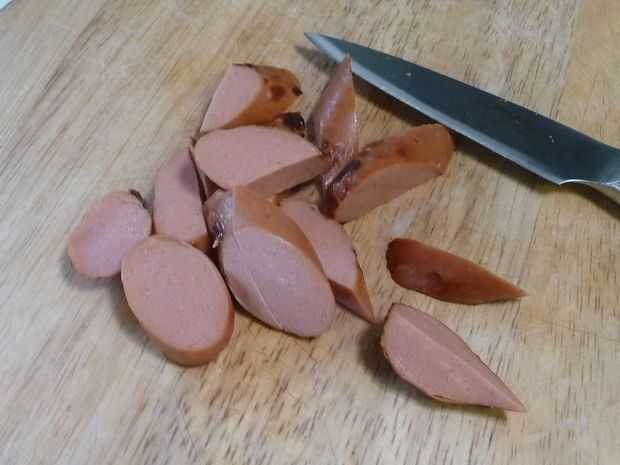 Parrilla salchichas de 1 o 2 (dependiendo de su apetito ;-) Cortar las salchichas en rebanadas diagonales. Colocar en un bol y reservar.