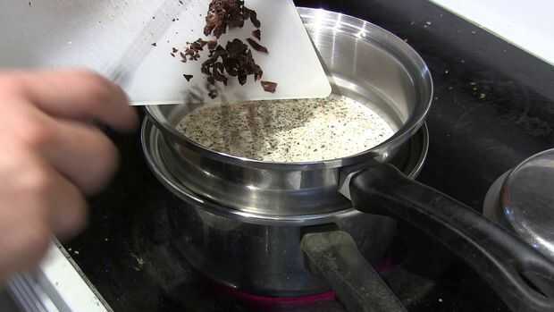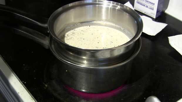 Mientras que el agua se está calentando, la mezcla en la leche, picada tomates secados al sol, y pimienta negra en la caldera superior. Esto se cocine a fuego lento mientras el agua se calienta y cocina la pasta. Una vez que el agua esté hirviendo, añadir la pasta.