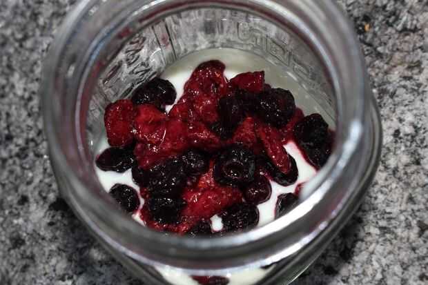 Para montar este postre para chuparse los dedos, comencé con el yogur y capas con algunos granola, más yogur y bayas. Con una última cucharada de bayas por encima, el postre estaba listo para servir. En este paso, puede poner tu creatividad a trabajar y hacer este postre en una obra de arte. Cavar y disfrutar de esta delicia de mochilero realmente único.
