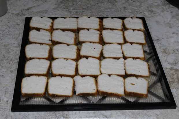 Usted encontrará que el pastel de Ángel deshidratado no se comprime mucho, pero se pone muy crujiente. Si usted vive en un ambiente húmedo, asegúrese de obtener el pastel de Ángel en una bolsa de plástico, poco después de que termine deshidratado, ya que fácilmente absorbe la humedad en el aire! De hecho, si bien no es necesario, si tienes un Foodsaver o algún otro dispositivo de sellado al vacío, recomendaría utilizar para el pastel de Ángel. Bolsas de plástico funcionan bien; una bolsa de congelador estilo ayudará a mantener tan herméticas como sea posible.
