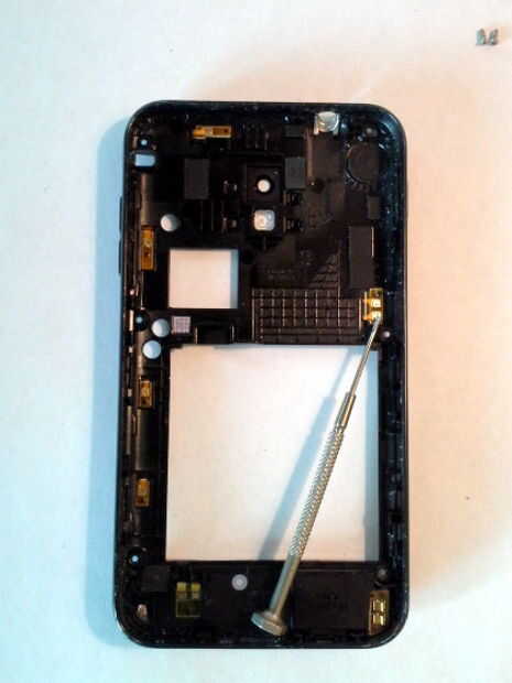 A pesar de los contactos de la placa base no toquen la superficie de la antena, no creo que hay una conexión de metal a metal. Puede utilizar un destornillador pequeño en la foto, o un pico de metal para raspar suavemente el material que recubre el punto de contacto. Hacer esto para todos los lugares que la placa base entrará en contacto con la parte posterior del teléfono.