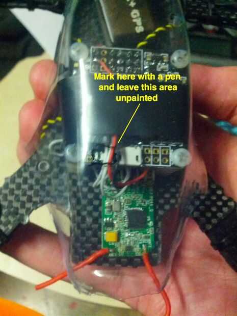 Con el dosel sin pintar equipado, marque con un bolígrafo donde son luces de LED de Naze32. Básicamente, si usted deja esta zona sin pintar, podrás ver el estado de la FC, incluso si tiene un bloqueo GPS!