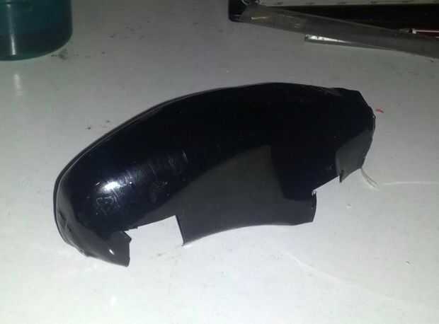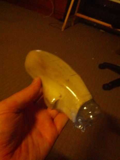 Entonces es necesario recortar la cubierta plástica para adaptarse. Esto le llevará varios intentos donde se hacen cortes pequeños, dejar espacio para los brazos, etc., con ajustes de prueba repetidos. Ver foto 3 para referencia del resultado final deseado.