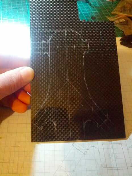 Rayar la forma de la placa (medida desde el plan) sobre la hoja de CF. Utilicé el punto de una brújula, pero se puede utilizar nada fuerte (y puntudo!)