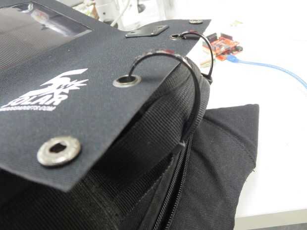 Tengo una mochila de Rush 24 táctico 5.11 que normalmente utilizo cuando voy en mis caminatas, y afortunadamente tiene un estándar de montaje llamado MOLLE para la fijación de sus bolsas. Esencialmente esto significa que la mochila se cubre en 1 pulgada lazos que puede enhebrar cosas sin dañar la bolsa. Por lo tanto, para colocar el panel solar utilicé unas bridas que significa son semi permanentemente sin dañar mi bolsa.