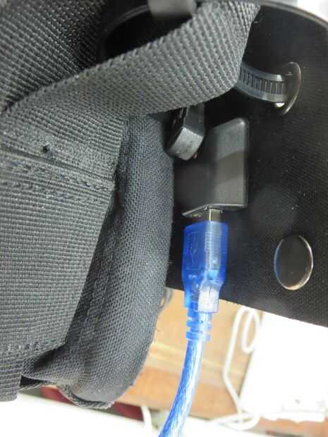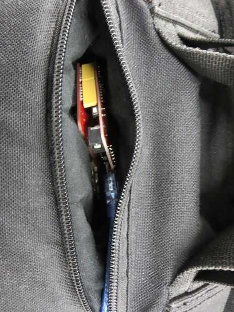 La bolsa tiene una bolsa de la cámara como la parte superior al lado de la manija, que tiene un buen fieltro forro para proteger la cámara, por lo que podría funcionar bien para proteger la electrónica de Arduino. Montara el conector USB hacia la parte superior de la bolsa para que el tramo de cable es muy corto y limpio (sin cables a ordenado lejos).