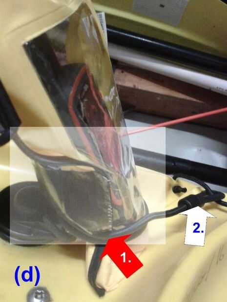 - Con el dispositivo en el soporte, coloque el "protector de salpicadura" sobre y tire hacia abajo para la posición, luego tomar el bungee y pasar abrigo alrededor de la base de la "falda" un par de veces,(imagen d-1.) a través de una hebilla d en la salida lateral de la bolsa y a través de la cuerda en el GPS, antes corte apagado en el punto de fijación. (imagen d)