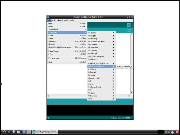 Abra el IDE de Arduino y abra el ejemplo dGPS_Example_3 de la carpeta dGPS_Example_3 . Cambiar el programador Frambuesa Pi GPIO y subir el dibujo a la Arduberry (utilice Ctrl + Mayús + U).