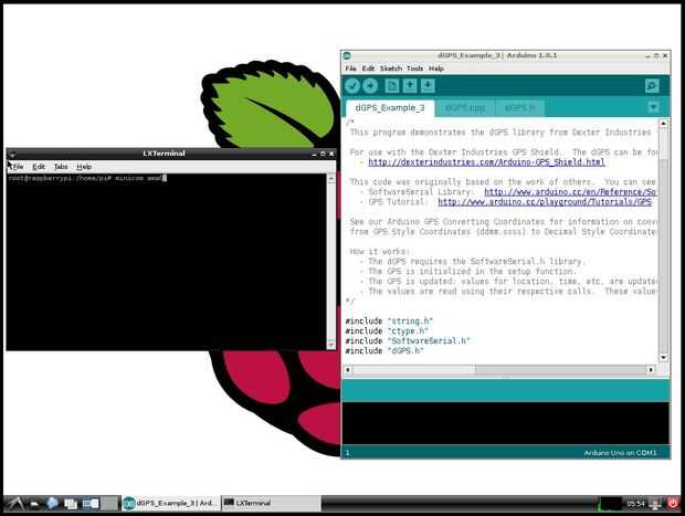 Los datos que proviene del escudo de Dexter industrias GPS viene en el puerto serie a 9600 baudios. Monitor Serial abierto minicom en Terminal