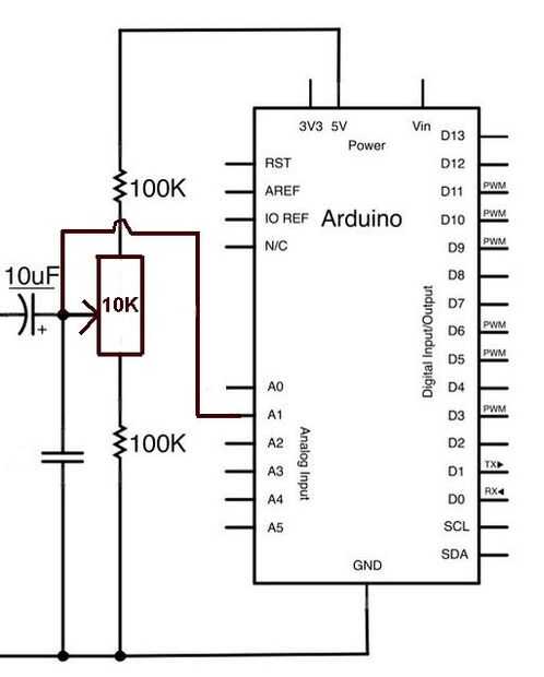 Te recomiendo que incluyas una resistencia variable en la sección de divisor potencial para que la entrada se puede ajustar cuidadosamente para centrar alrededor de un valor de entrada medido de 128 (la mitad de los 0-5 tensión de alimentación. En mi PC "5V" es menor que 5V cuando alimentado por el USB.)