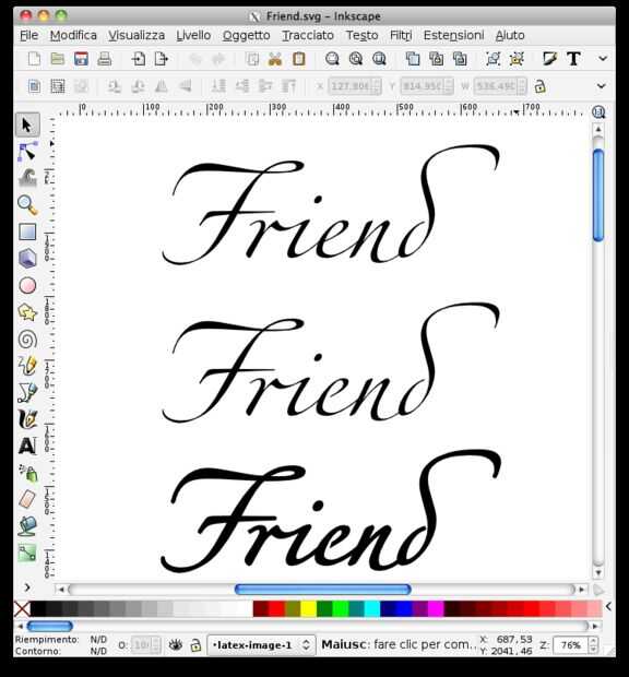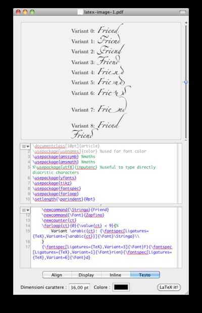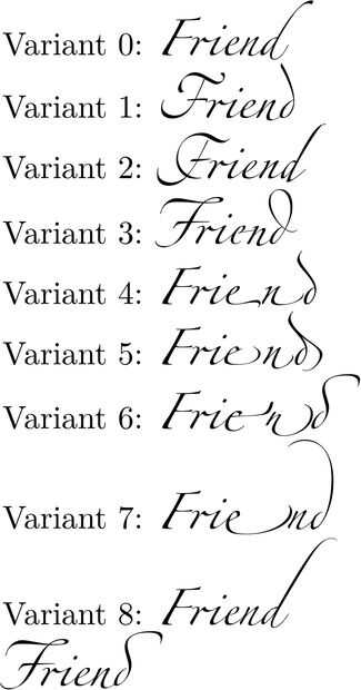 Puesto que la Zapfino tiene muchas variantes para sus glifos explota esta característica usando diversas variantes de las letras. Un software que puede mostrar variantes es XeTeX, que es gratuito y de código abierto. Utilizando el paquete fontspec de XeTeX he creado una imagen con todas las variantes de los glifos de la palabra "Amigo", y luego elegí la mejor combinación para mi gusto.