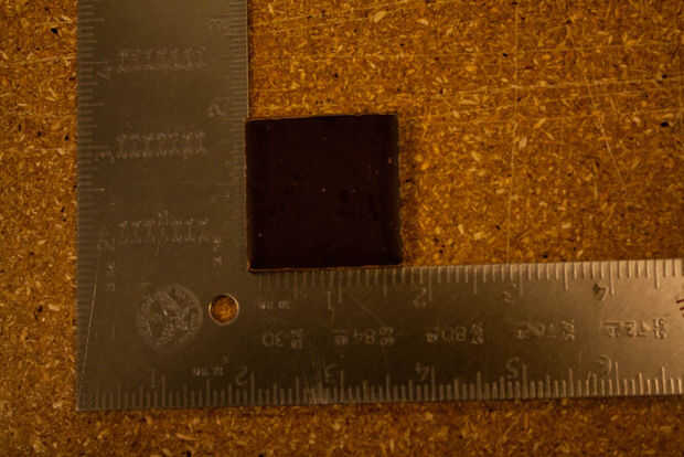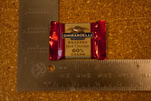 Una vez que tienes tu chocolate elegido — tomé un mini extra amargo Ghirardelli cuadrado, usted tiene que saber las dimensiones de la pieza de chocolate, para que no grabe fuera de la pieza de chocolate real que desea grabar. Mis piezas se elaboran a 1,7 "x 1,7".