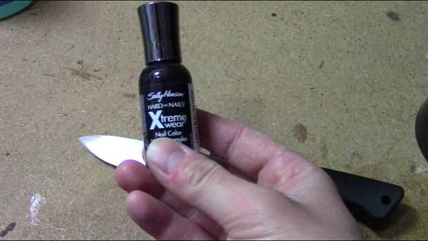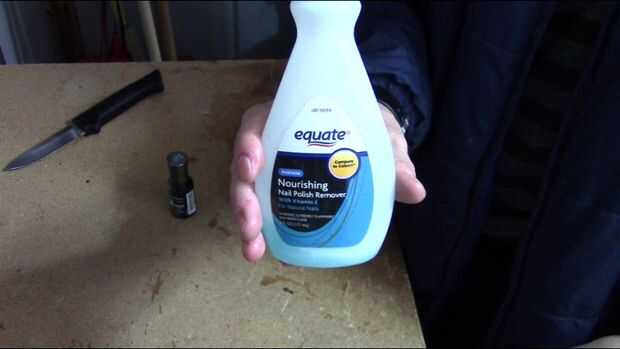 Saque un removedor de esmalte de uñas, cloruro férrico, cuchillo y esmalte de uñas
