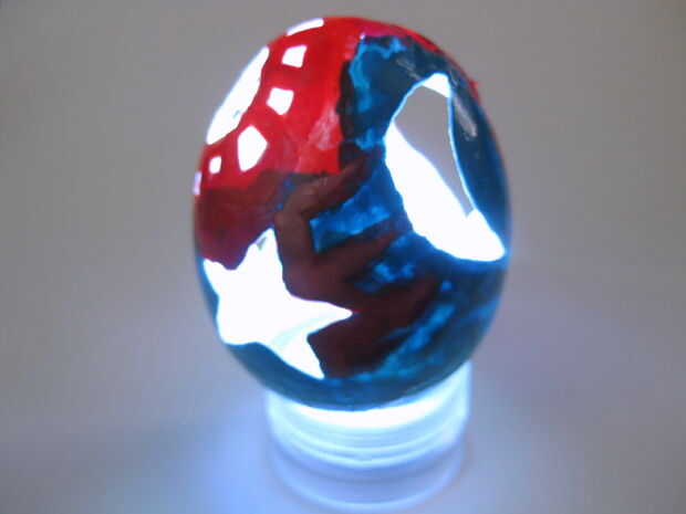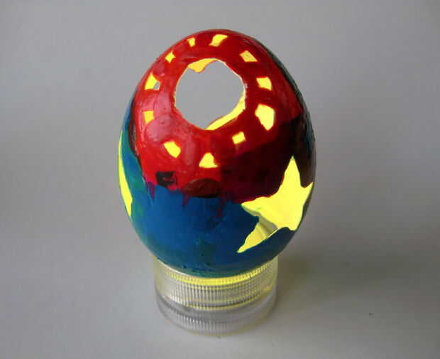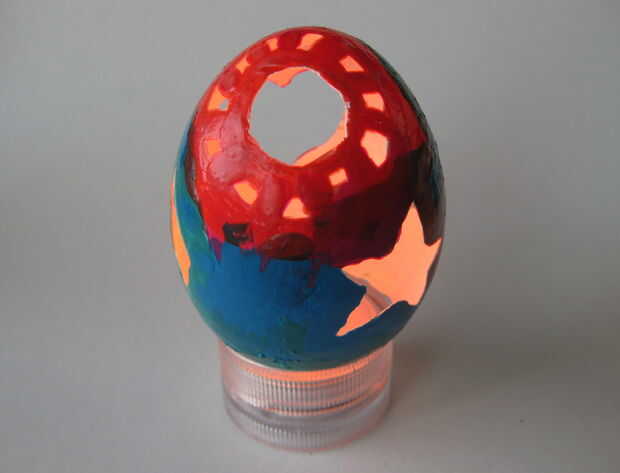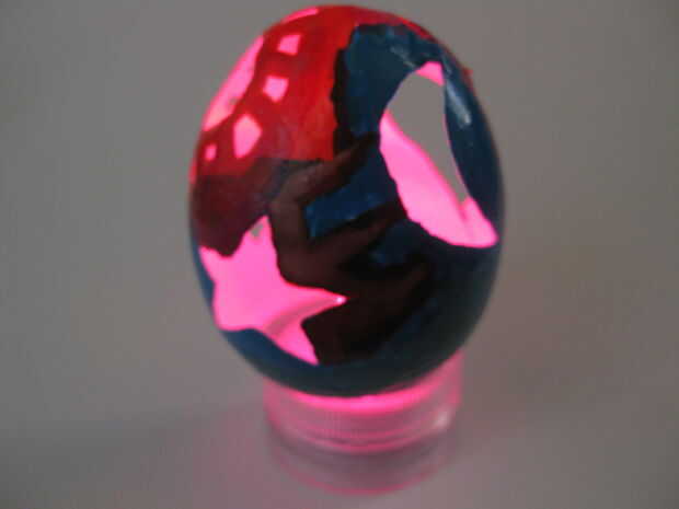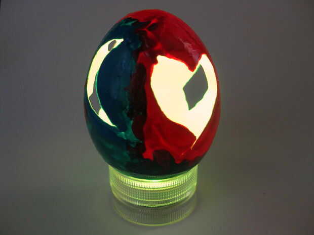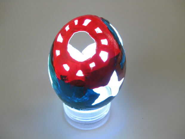 Era capaz de poner la cáscara de huevo encima de la lámpara de LED y encajan perfectamente. Utilicé un poco de pegamento blanco de la escuela a mantener la cáscara en su lugar y esto funcionaba bien para mí. (Si quieres algo más robusto, puede probar otras colas, resinas epoxi, etc., que trabajan con plástico o cualquiera que sea el material de la lámpara.)