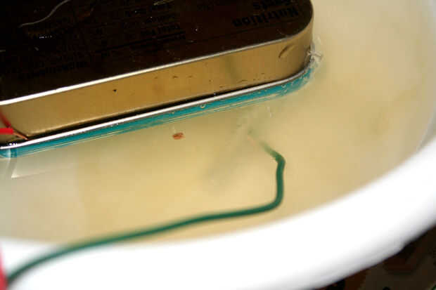 Una vez que las burbujas, te darás cuenta que el agua empieza a cambiar los colores. Puede variar dependiendo de los metales que está utilizando. Finalmente habrá alguna escoria así. Esto es todo normal. En las fotos, puede ver va de mina un poco naranja.