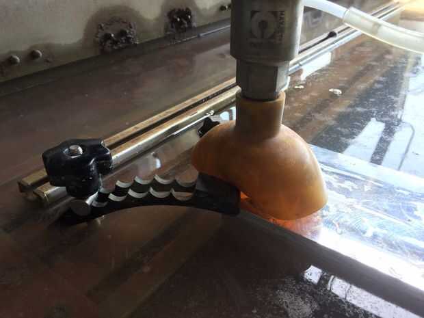 De vez en cuando, usted trabajará en una hoja más pequeña del material, especialmente si sólo estás pruebas ajustes y no hay mucho espacio para las pinzas. Si es el caso, es aceptable para el protector de salpicaduras de goma para toparte con abrazaderas, solo asegurarse de que no choca la boquilla dentro de! Además, asegúrese de que usted baje la taza y posición tal que cuando la boquilla empieza a mover, la Copa no pillar las abrazaderas (ver imágenes).