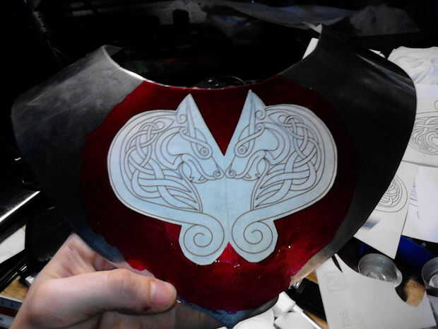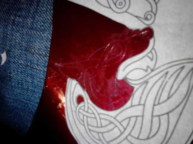 Ahora puso en su diseño o dibujo por sobre el esmalte o pegamento en su diseño impreso (utilicé papel adhesivo A4). Trazar su diseño con un hobby / cuchillo del exacto, por lo tanto tallado en el esmalte. Ir lento y constante con esto, no empujar demasiado duro. Si tornillo usted puede solucionarlo con algún esmalte, pero si te rascas el metal su probablemente permanente.